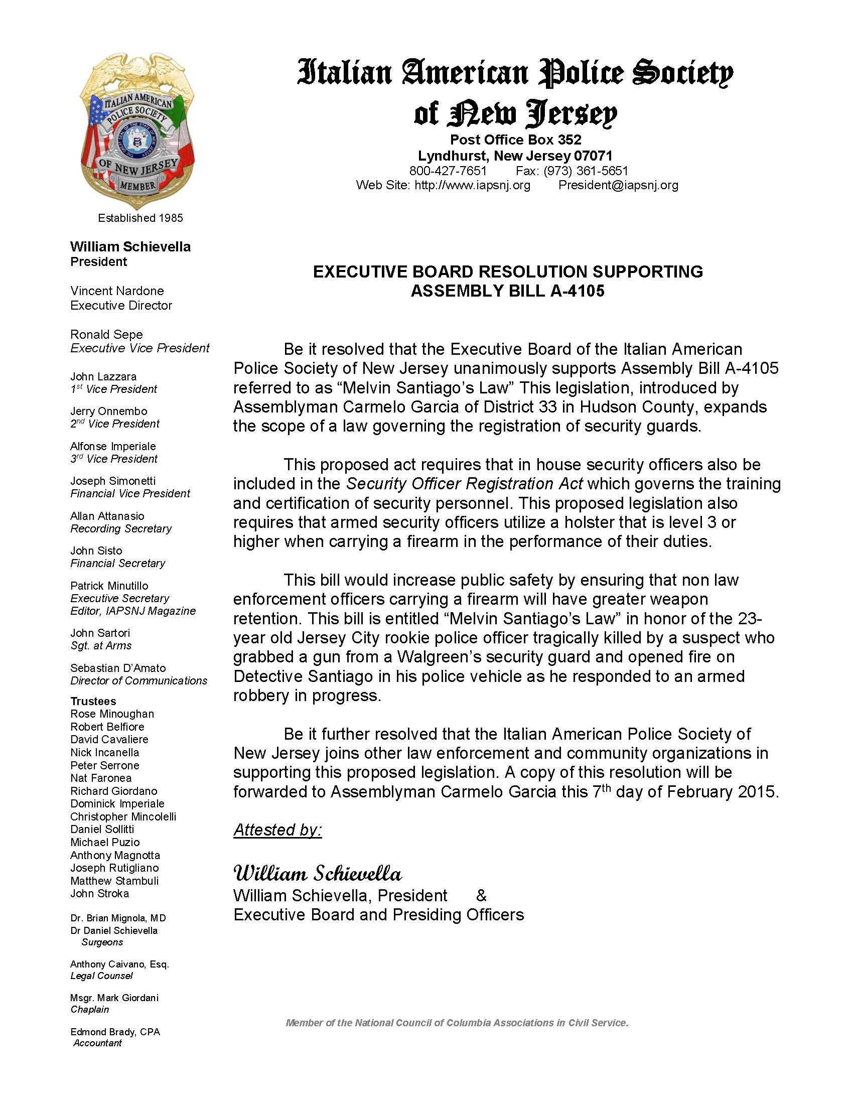 On February 7th 2015 the Executive Board of the Italian American Police Society of New Jersey unanimously sponsored an Executive Board Resolution in support of Assembly Bill A-4105 sponsored by Assemblyman Carmelo Garcia. This bill would enact the “Melvin Santiago Law” which would expand the supervision and registration of armed security officers in NJ. This proposed legislation would also require them to wear level 3 or greater protection holsters when carrying a firearm in the performance of their duties. This law is in honor of Jersey City Police Detective Melvin Santiago who was killed in the line of duty while responding to an armed robbery in Jersey City.